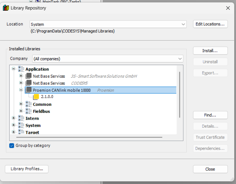 CODESYS > Managed Libraries. For the file, Go to Download Center > 01_Proemion_Devices > 09_CANlink mobile 10000 > 10_Other Software. -