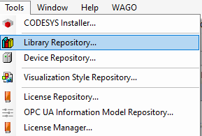 In CODESYS, open the Library Repository window via Tools > Library Repository.