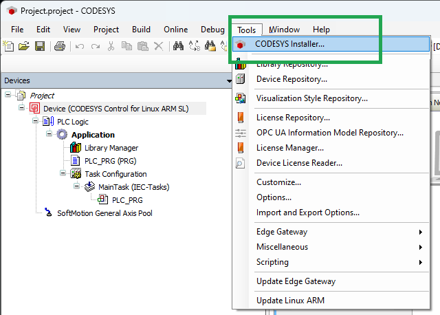 Open the CODESYS Installer via Tools > CODESYS Installer: