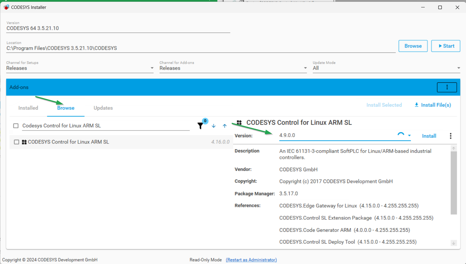 Search for CODESYS Control for Linux ARM SL and install the correct version.