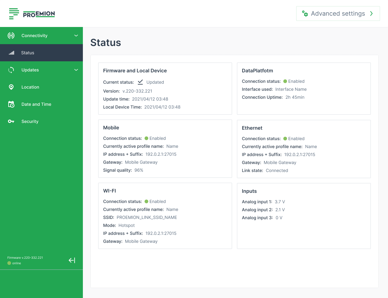 The Status page in the configuration web UI shows the device's status information about various interfaces and connections.