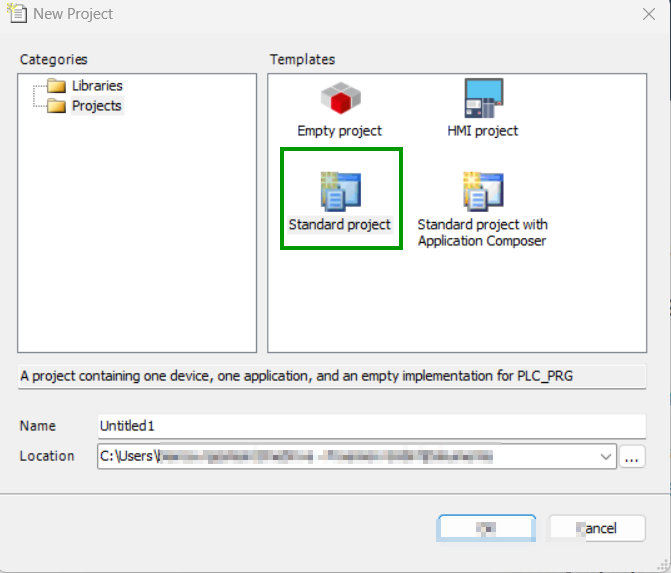 Open the CODESYS IDE, create a new project via File → New Project → Standard Project and choose a Name and Location for your project.