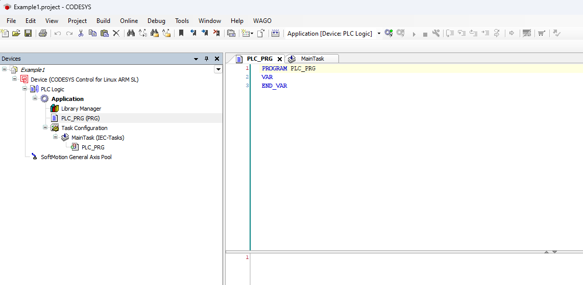 If the device CODESYS Control for Linux ARM SL is not available, it may not be installed. Read Install CODESYS dependencies for installation instructions. An empty project similar to the following screenshot should be created.