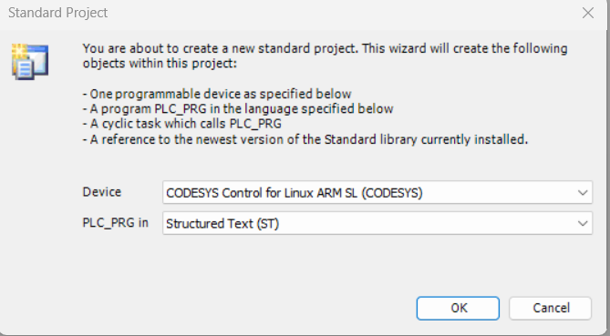 - Choose programming language for PLC_PRG: Structured Text (ST)