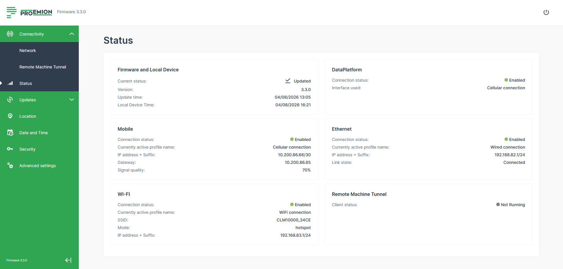 The Status page in the configuration web UI shows the device's status information about various interfaces and connections.