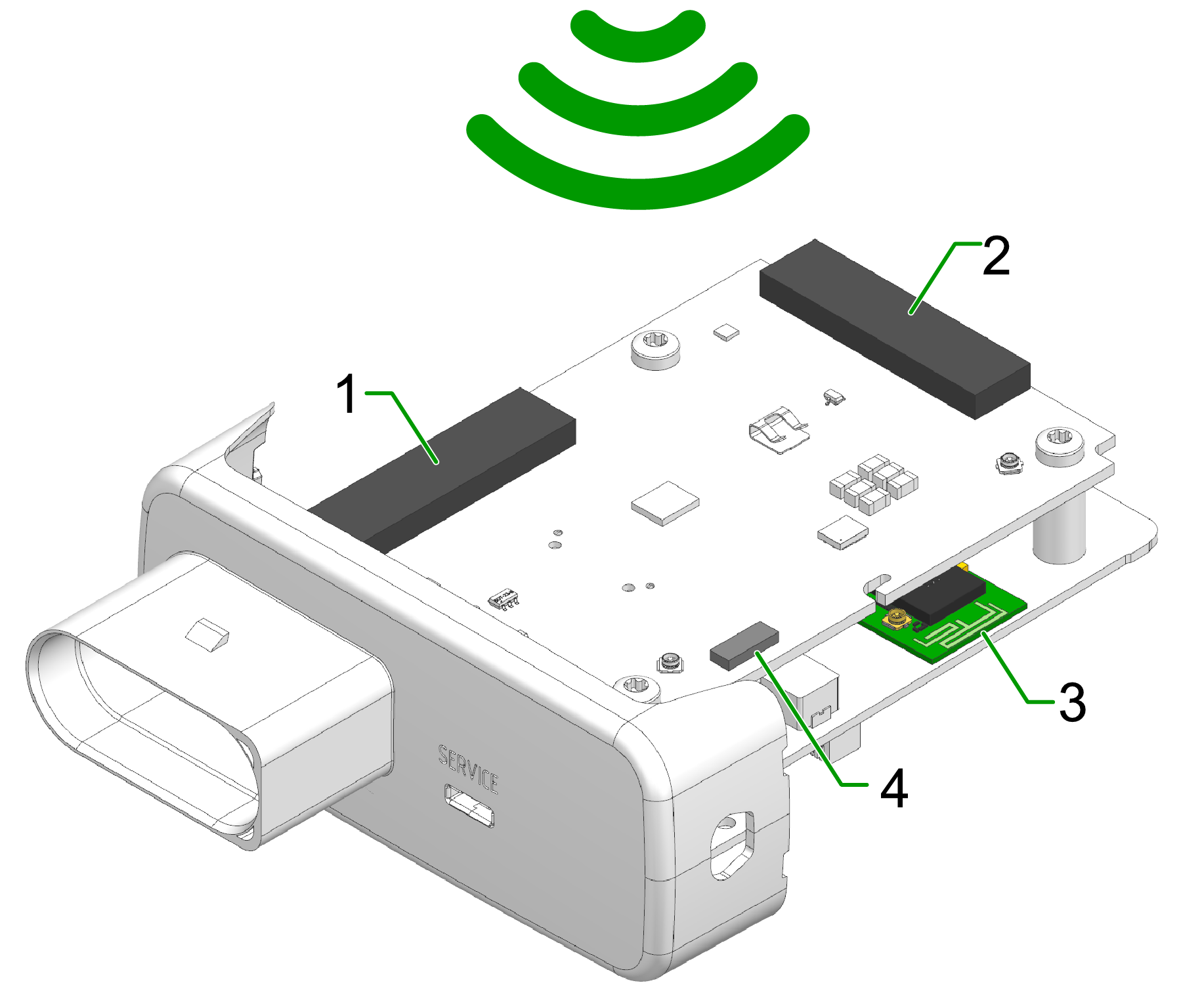 The position of the internal antennas is fixed within the device. Signal performance therefore strongly depends on the device orientation and installation environment.