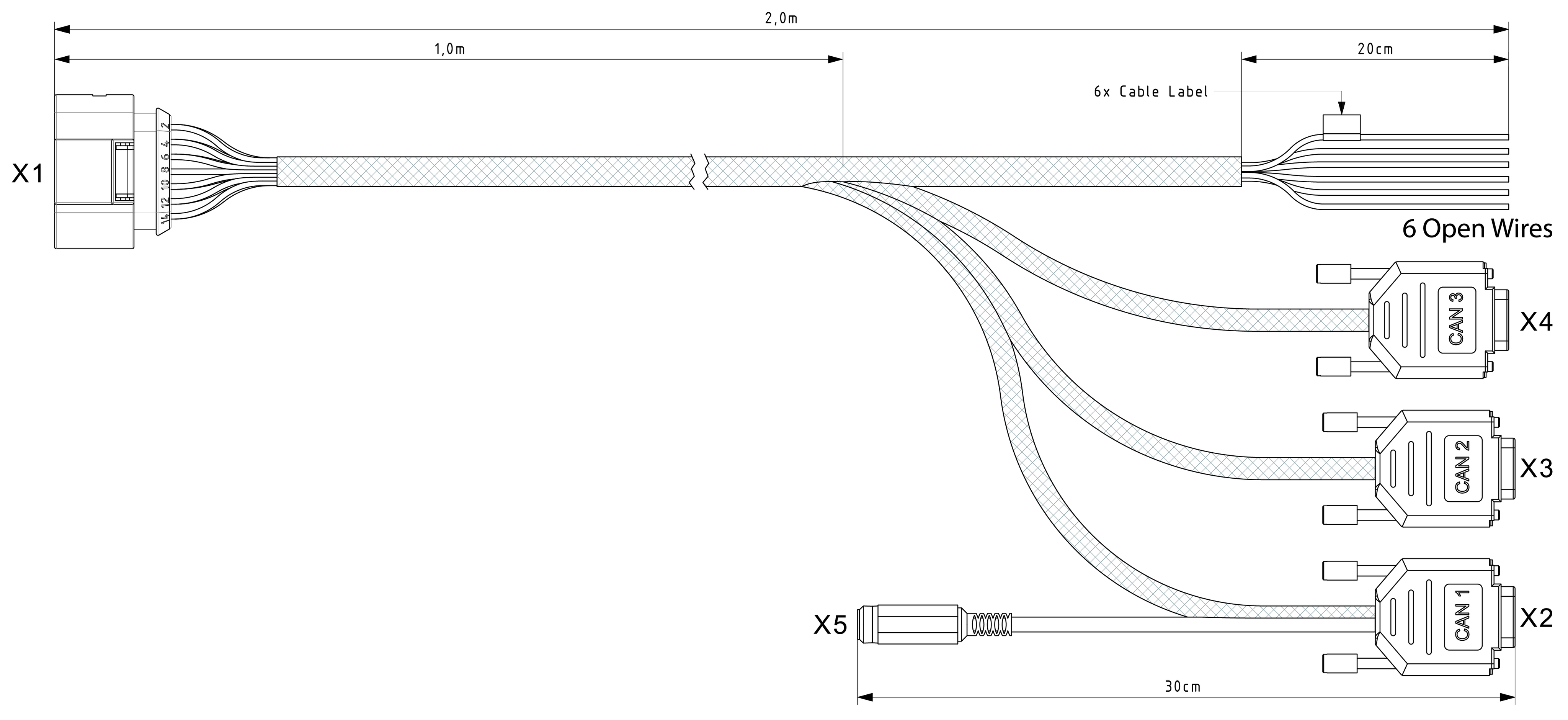 The cable CLM3600 Starter Cable 6open 3dsub 1pw 2m (part number 136000202), which is also applicable for the CANlink® mobile 10000, must be used for the CANlink® mobile 3600 and CANlink® mobile 10000 variants and is equipped with the following connectors and open individual wires: