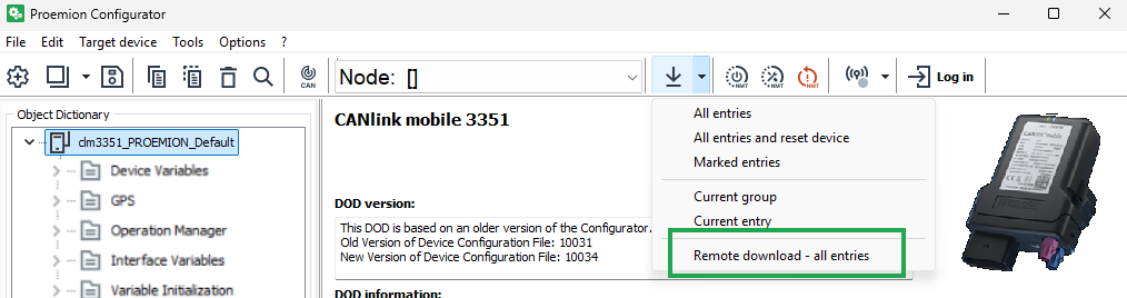 Click on TARGET DEVICE > OBJECT DICTIONARY > DOWNLOAD > REMOTE DOWNLOAD - ALL ENTRIES or click on the arrow in the toolbar next to the DOWNLOAD ALL ENTRIES symbol.