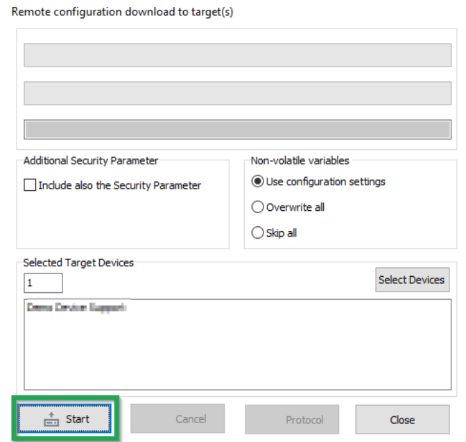 Click on the START button in the REMOTE CONFIGURATION DOWNLOAD TO TARGET(S) window.
