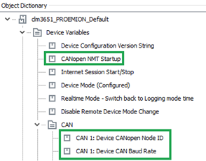 The variables required concern the CAN connection and belong to the object dictionary group DEVICE VARIABLES.