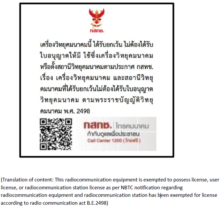The devices imported to Thailand must be labeled with the following label and these labels must be purchased from the regulatory authority NBTC by sending an email to erlicensing@nbtc.go.th: