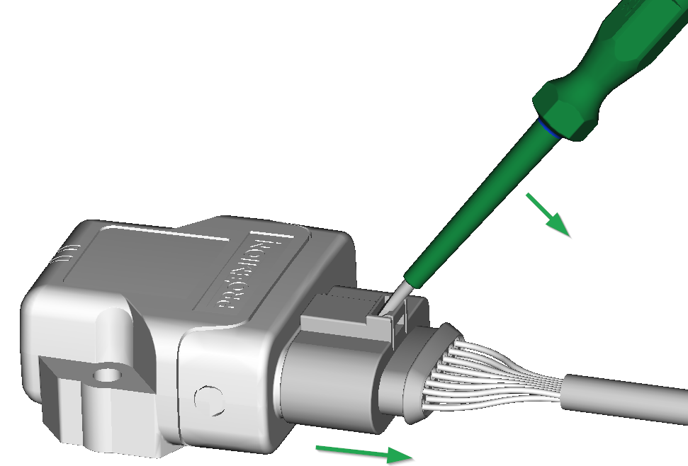 Use an appropriate flat-blade screwdriver to release the lock. To do this, insert the screwdriver into the tab from above, then gently lever it down and back. At the same time, pull the plug slightly backwards by hand. If you can hear a click, the lock has been released and the connector can be removed.