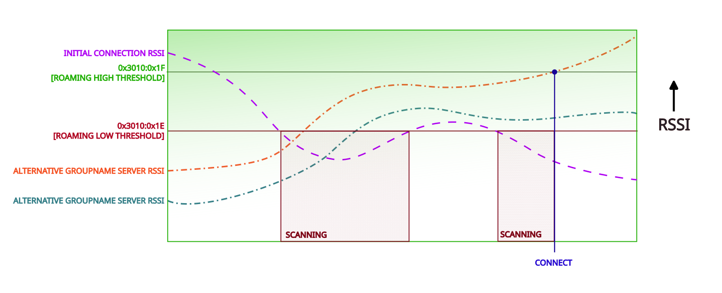 Client | During scanning, the Client will attempt a connection to a Server with an RSSI level above this value Refer to Roaming Thresholds |
