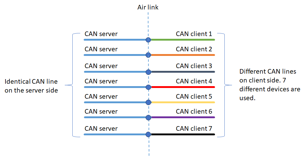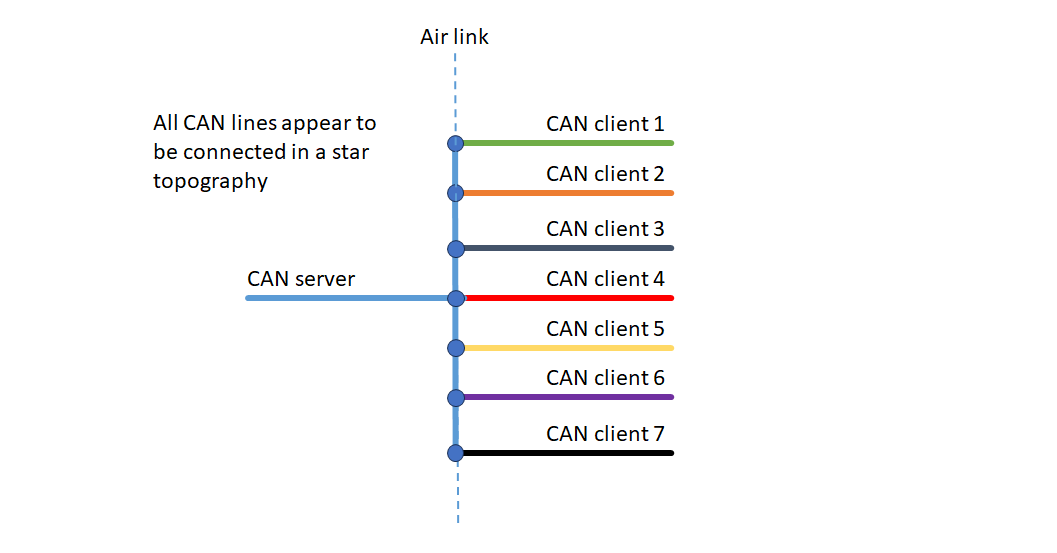 Each Client device receives all data present on the CAN bus of the Server, and puts it on their local CAN bus.