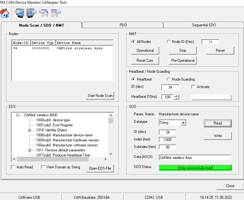 The CANlink® wireless 4000 supports the transmission of pure CAN messages to another device. No direct protocol interpretation is configured in the firmware. This makes it possible to use the device for different applications with various CAN transport protocols. The protocol logic must be implemented in the other device (e.g. in the PC software). An example is the implementation within the CANopen section of the RM CAN Device Monitor Pro CANopen software.