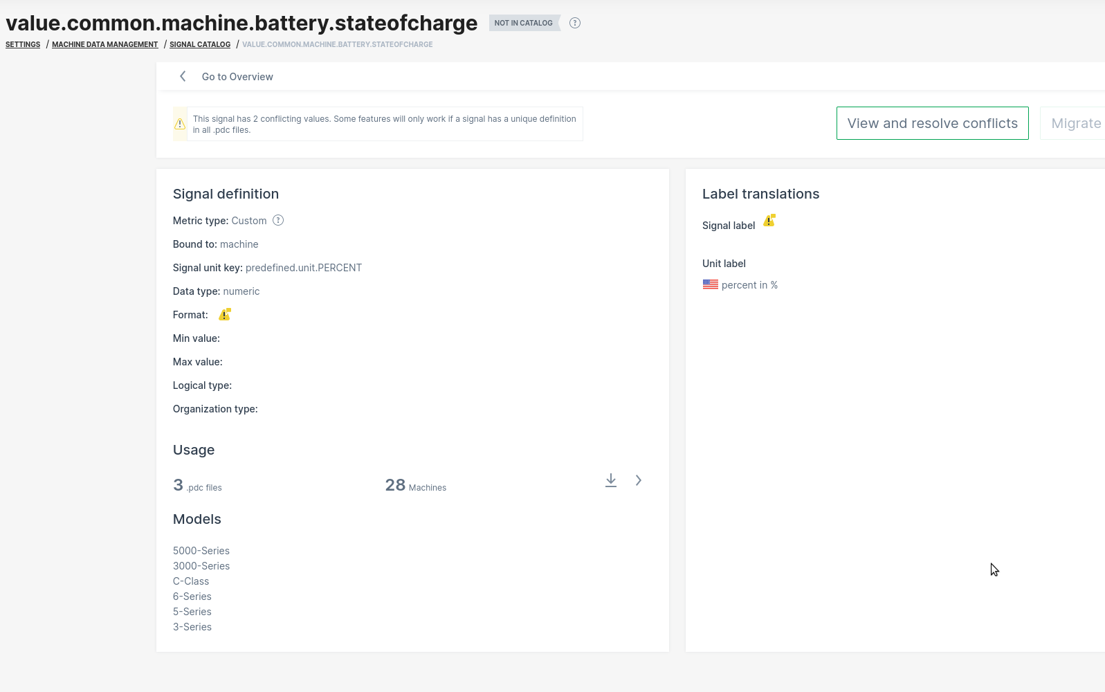 Signals that have conflicts cannot be migrated immediately, for example, when the same signal uses different units in different PDCs, e.g. meter and kilometer. The conflict icons in the Signal Catalog table and details indicate the signal definition values with conflicts: