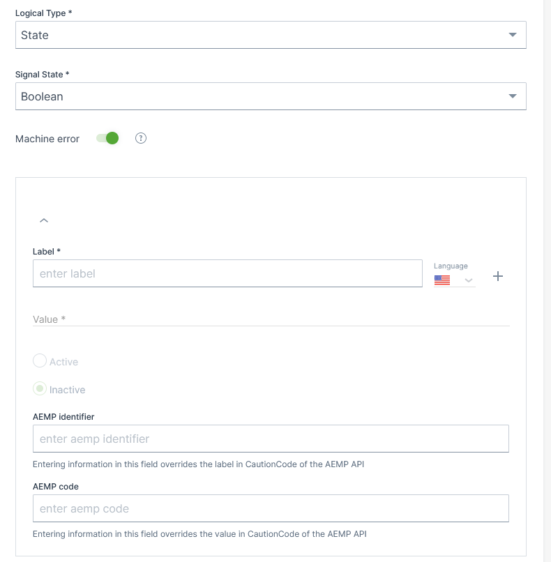 enumorboolean. Additionally, define the different states (Label and Value) and in case it represents a Machine error, define the AEMP identifier together with the AEMP Code.