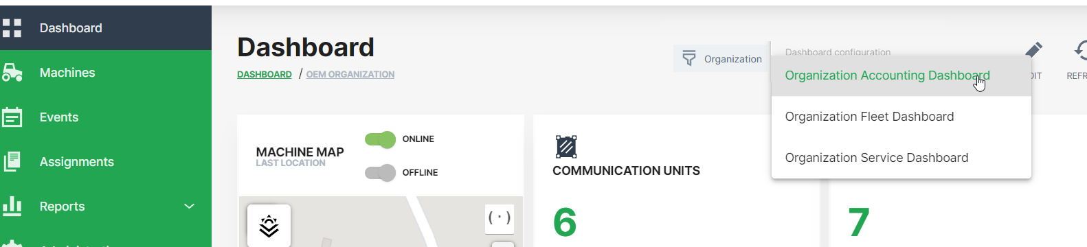 You can filter the organization dashboard by an organization type for your individual view. That means, selecting this filter changes your view of the organization dashboard to the one of either an OEM, Dealer or Machine Owner.
