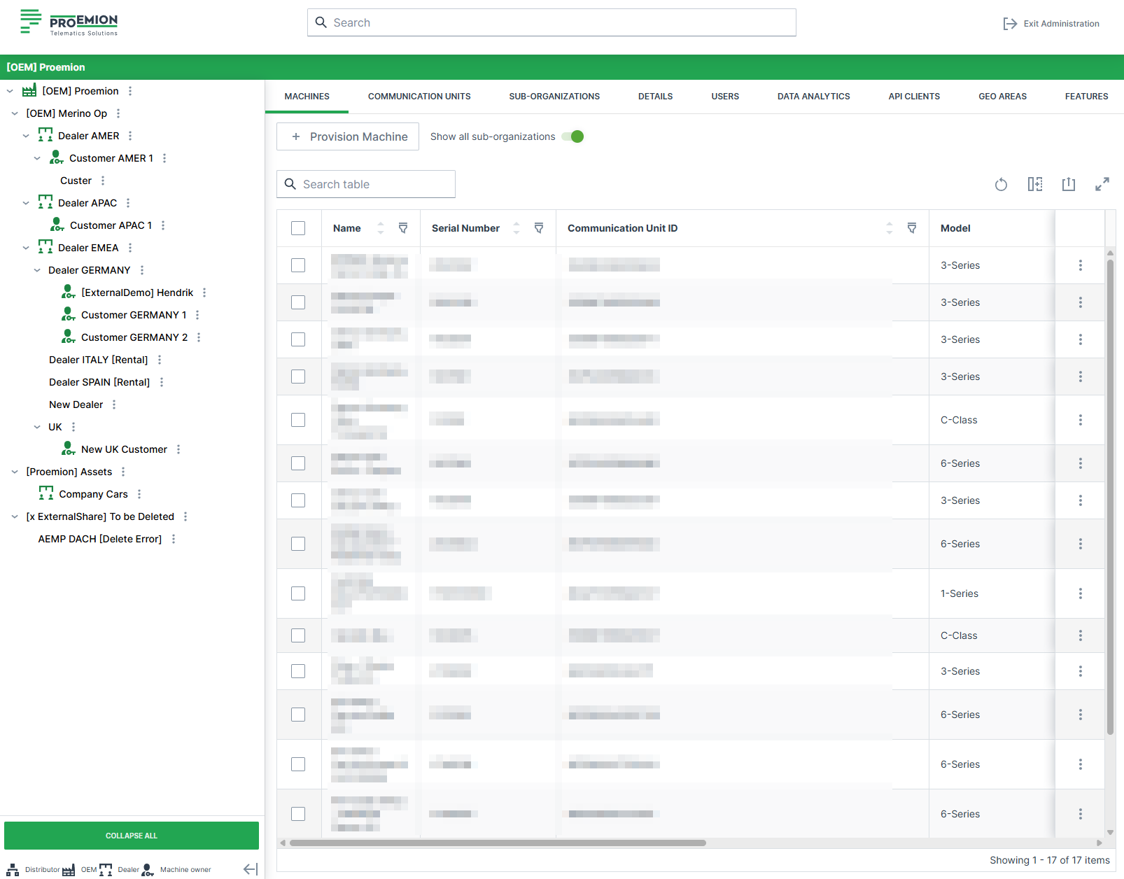 | Machines | Machines in the selected org (ID, VIN, PIN, Serial, Model). |