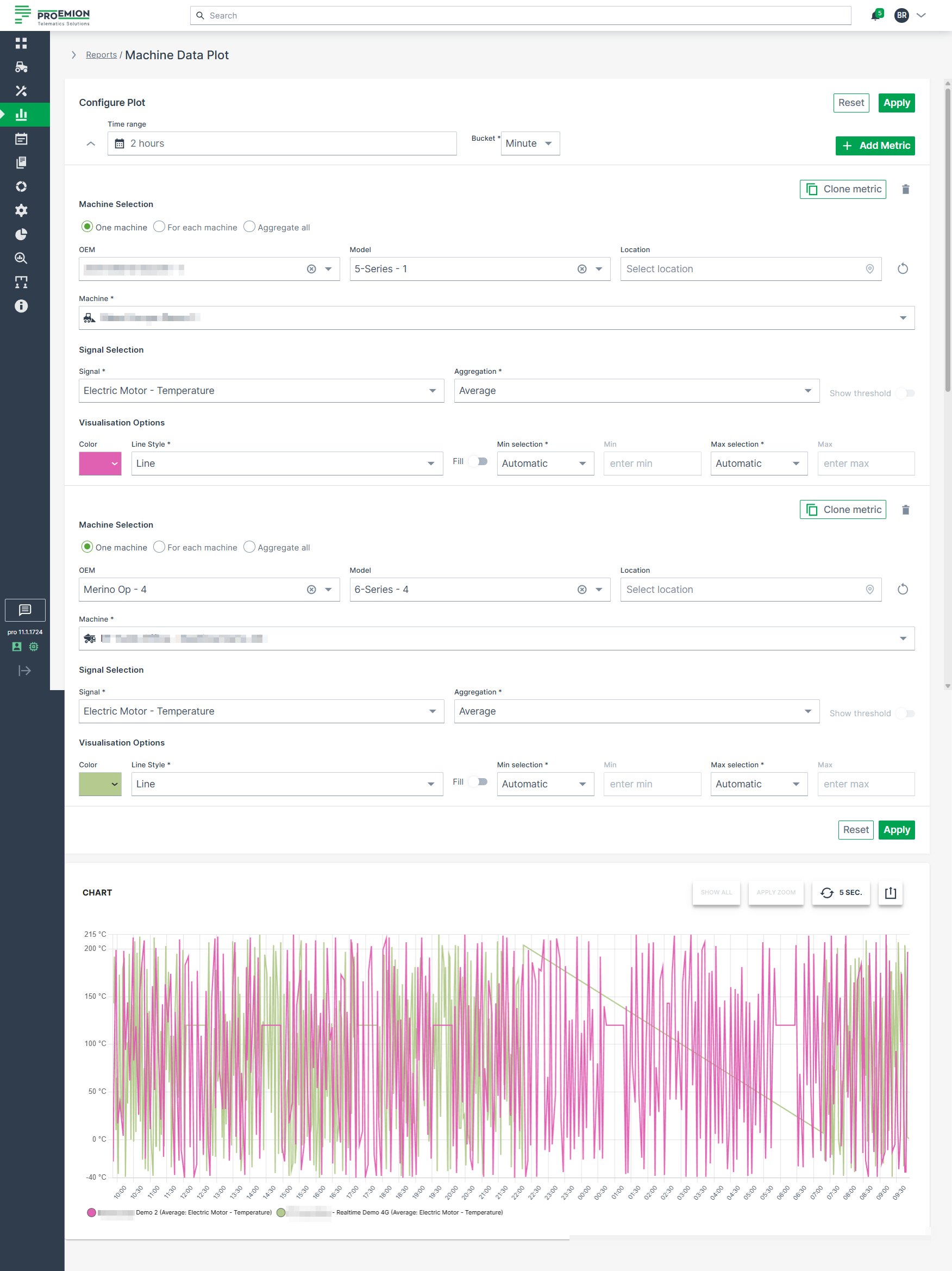 The following example shows data for an identical signal (Electric Motor - Temperature) from 2 different machines within a time range of 2 hours. For each measurement, the unit is displayed on the axis and in the tool tip.