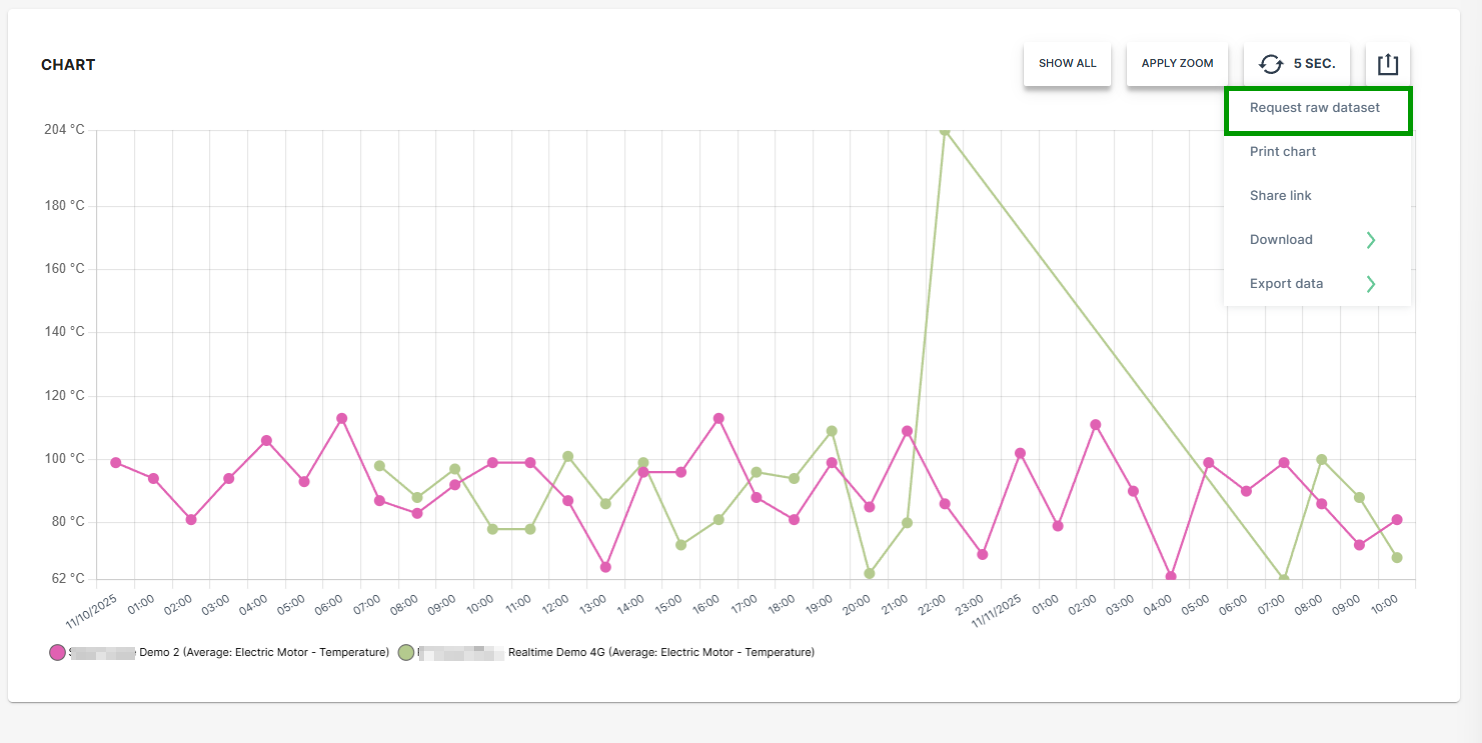 When the configuration of the machine data Plot exceeds the maximum of 10 machines and 10 signals for a time range of up to 7 days, the Request raw dataset option is greyed out and a mouseover message with the allowed configuration settings will appear.