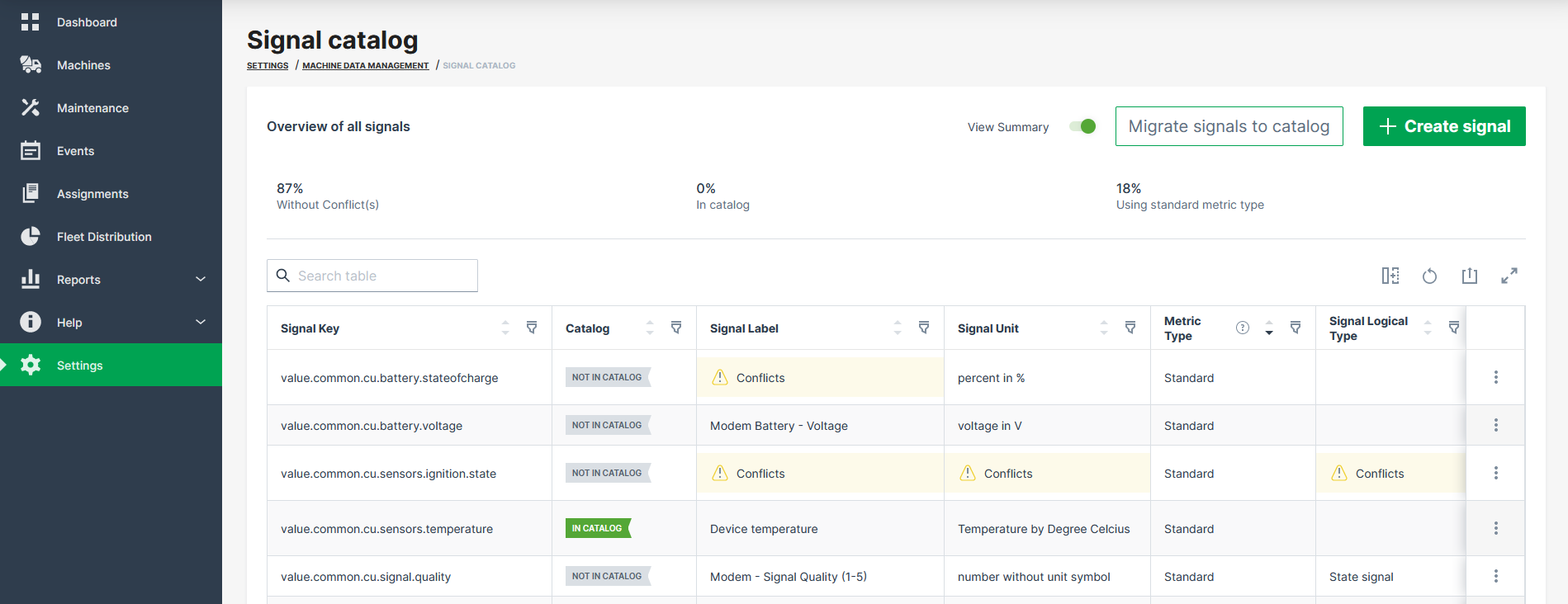 To access the signals in the DataPortal Signal Catalog, open Settings > Machine Data Management > Signal catalog.