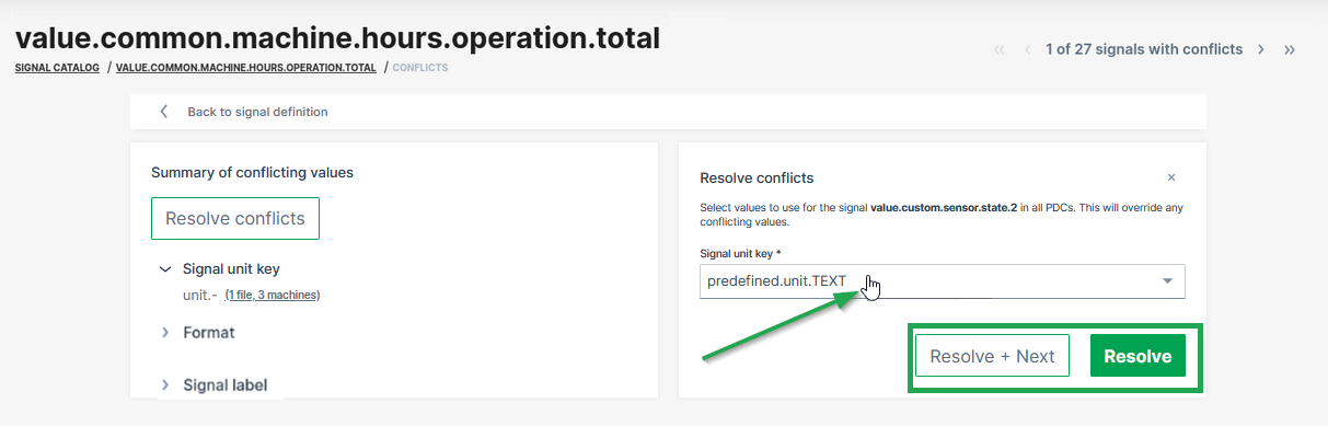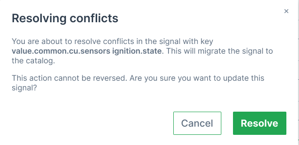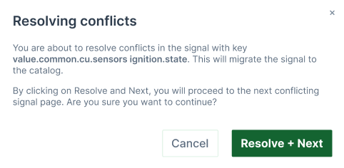 Resolve + Next Resolve Click Resolve + Next to resolve this signal and go to the next conflict. A new dialog window opens to confirm this update and automatically migrate the signal to the catalog and proceed with the next conflict: Click Resolve to resolve the current conflict. A new dialog window opens to confirm this update and automatically migrate the signal to the catalog: