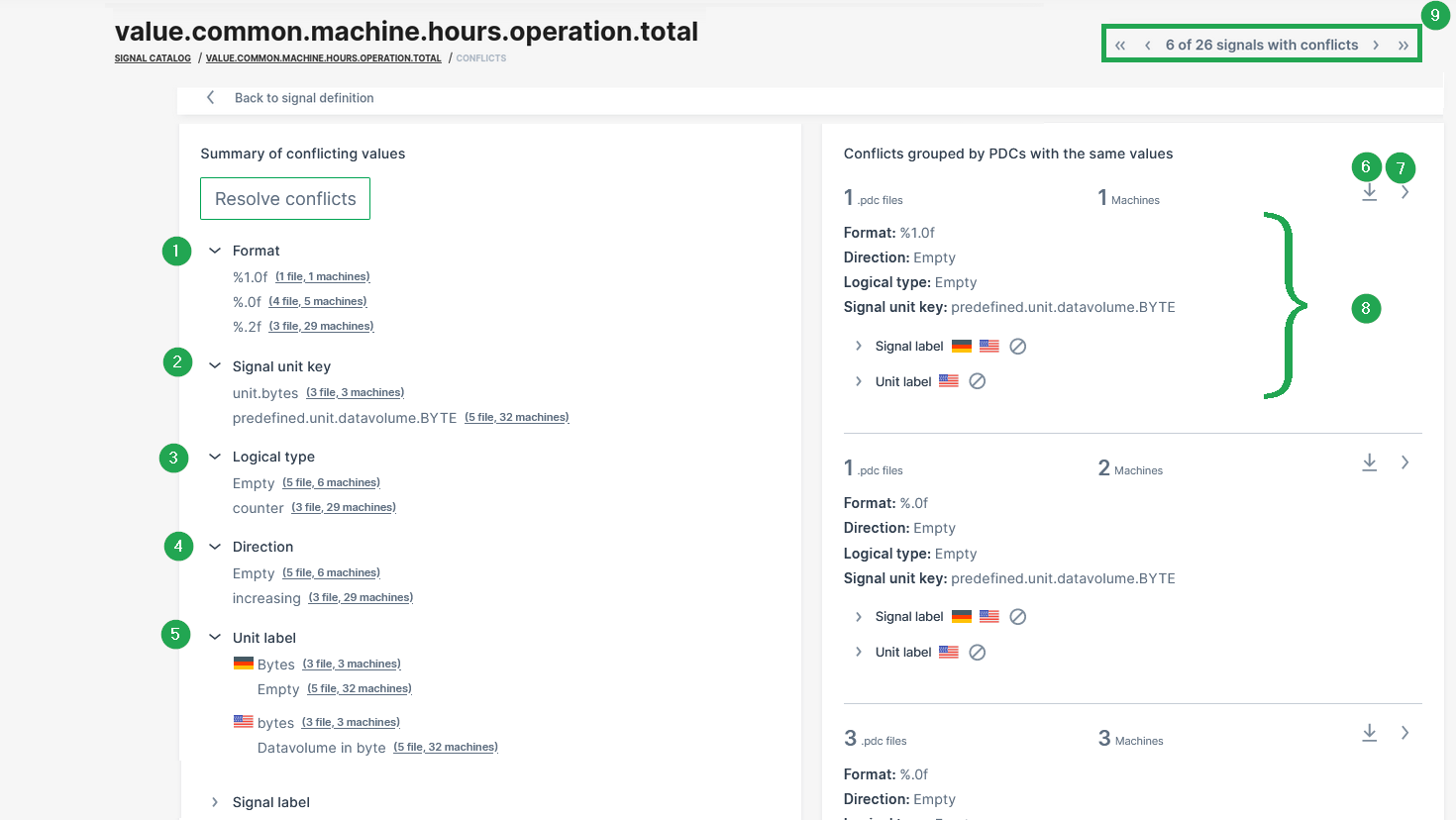 Figure 13: Conflict details # Item Description Summary of conflicting values 1 Format Maximum number of decimals is different across the PDCs. 2 Signal unit key The signal unit key is different across the PDCs. 3 Logical type There are 3 PDCs with no logical type defined. 4 Direction There are 5 PDCs with no direction defined. 5 Unit label There are 5 PDCs with not signal unit label defined and there is a variation with the spelling. Other conflicting values might be: Signal label There is a wrong unit label configured. Custom Units There is a conflicting custom unit. Resolve it by selecting one of the predefined units from the list of standard signals (not from PDC). Permissions The assigned access permissions for this signal are not aligned. Conflicts grouped by PDCs with the same values 6 Conflicts per PDC Summary of the conflict related parameters for the specific PDC file. 7 Download of PDC Option to download the affected PDC file in xml format. 8 Details See further version details of this PDC. 9 Navigation Navigation through all signals with a conflict. -
