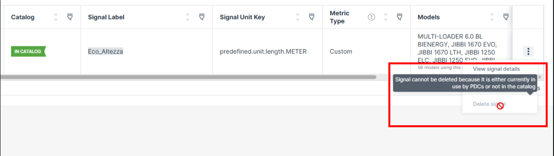 Delete signals: The Delete signal option is disabled (greyed out) if the signal is currently in use by one or more PDCs, or if it is not present in the catalog. Please verify the signal's usage and catalog status before attempting to delete it. A corresponding message is displayed in the DataPortal when attempting to delete a signal, see screenshot: