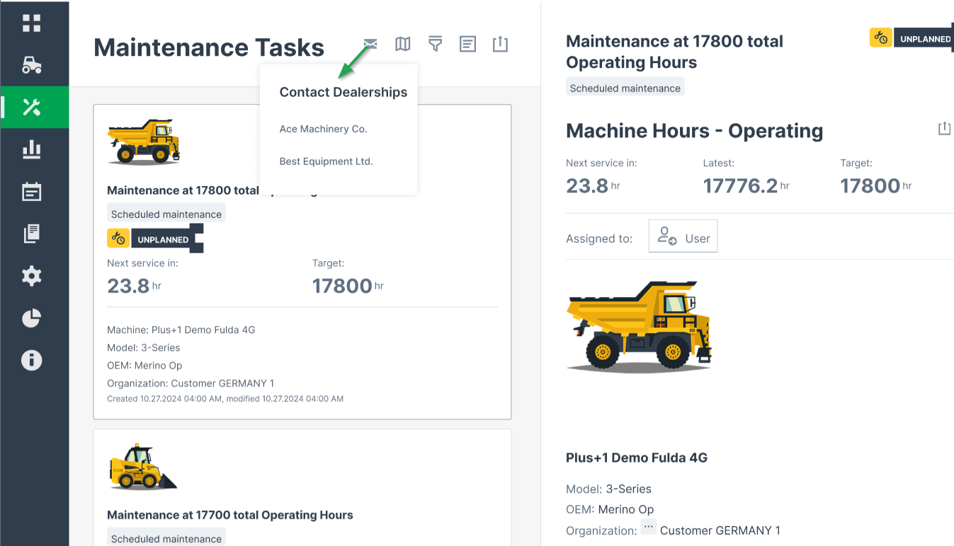 As a Machine Owner, you can contact any dealership directly via the DataPortal - either via the Machine Details Page or via the Maintenance Task Page.