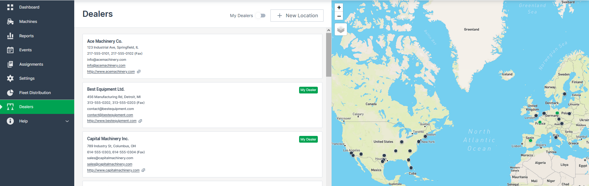 Dealers and OEMs can manage their own locations, update contact details, and ensure visibility to machine owners.