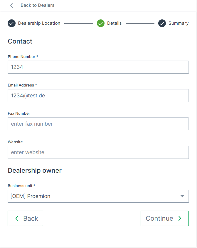 During creation or editing, they can assign ownership to a specific Dealer business unit (Dealer BU), see Add new Dealership. This functionality enables OEMs to actively manage the dealer network structure and ensure that Machine Owners can immediately contact the correct service location (without relying on each dealer to set up their own locations).