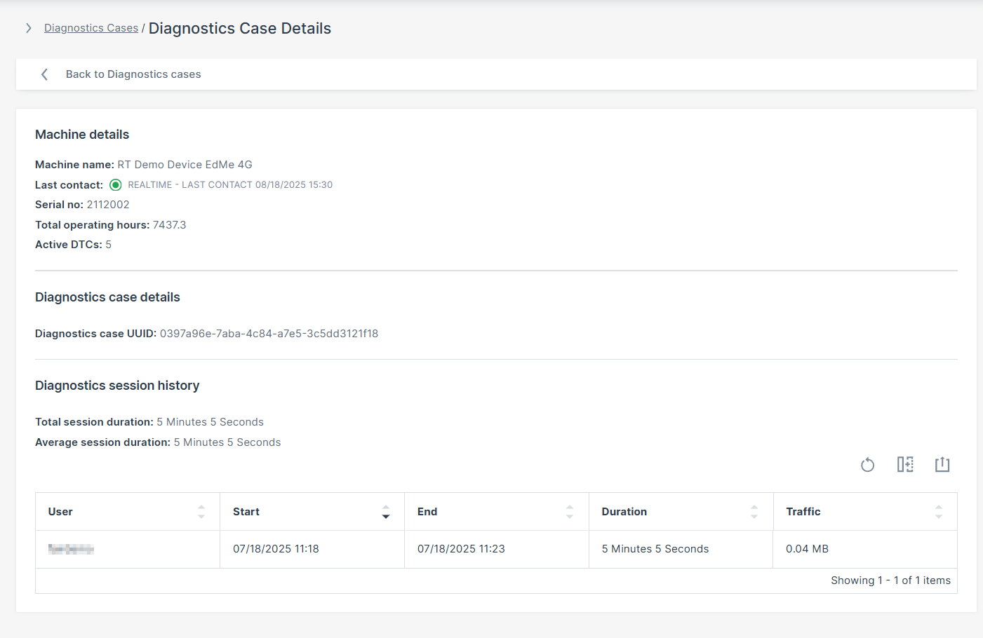 On the Diagnostics page you can view all Diagnostic Cases for the selected time period, including active sessions, past sessions, and the corresponding contract usage.