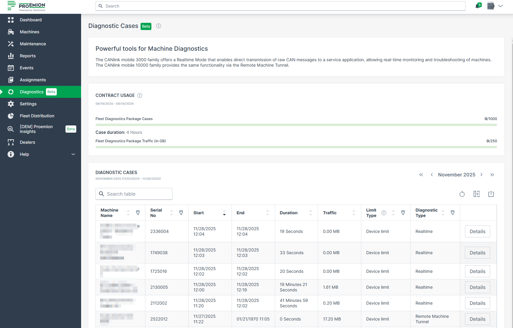 The number of available Diagnostic Cases — i.e., the remaining limit value — is updated once per day. However, the number of used Diagnostic Cases is updated immediately when a new case is started. Diagnostic sessions initiated by the Proemion Support team do not count against your contract quota. Only Diagnostic Cases of the last 24 months can be displayed.