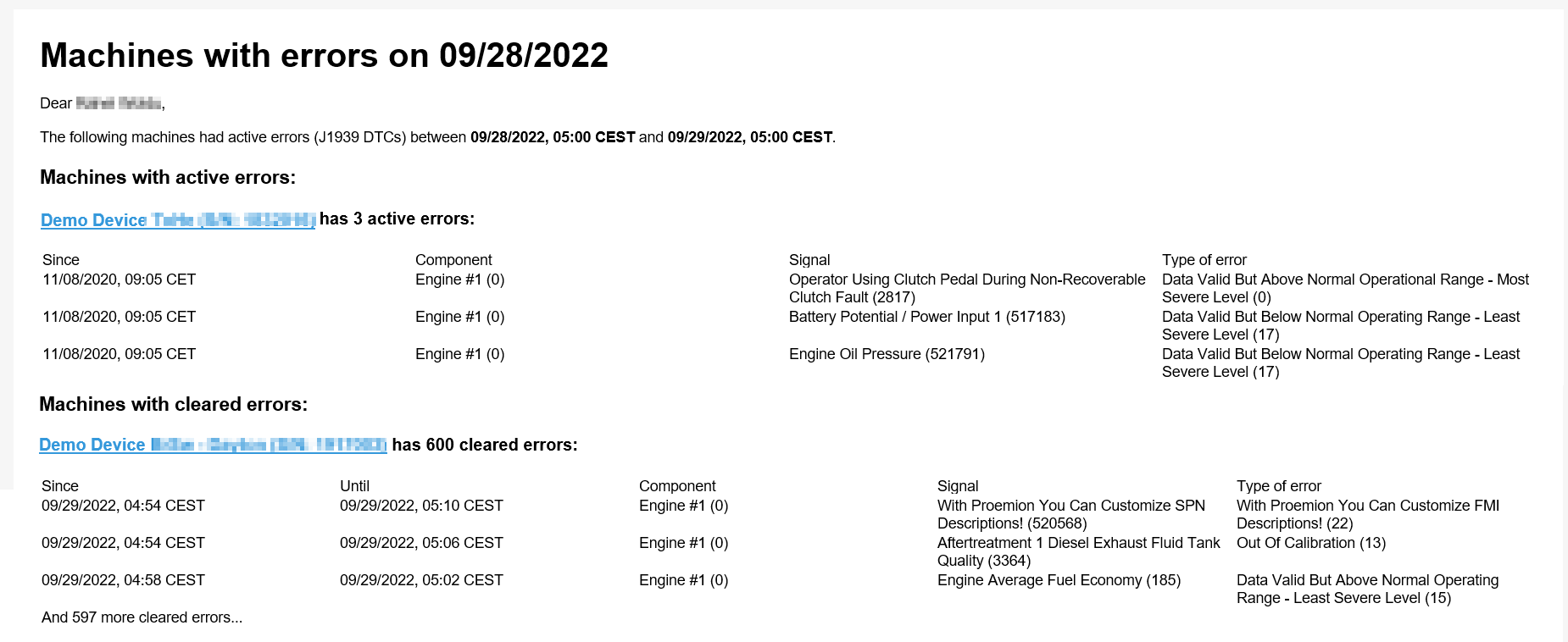 The Proemion DataPortal features a daily email summary of machines with DTCs (diagnostic trouble codes or errors codes) within the previous 24 hours (active and cleared errors). This feature enables machine owners to quickly identify machine issues and track their resolution