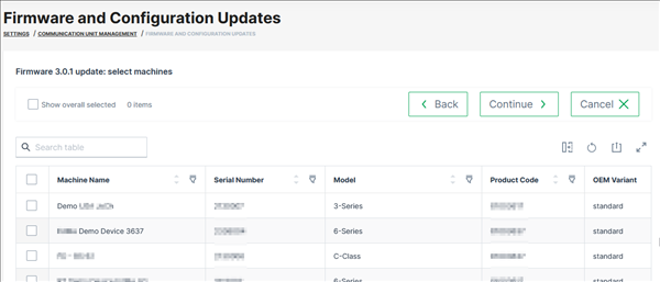 Choose all or specific machines for the firmware update and Continue.