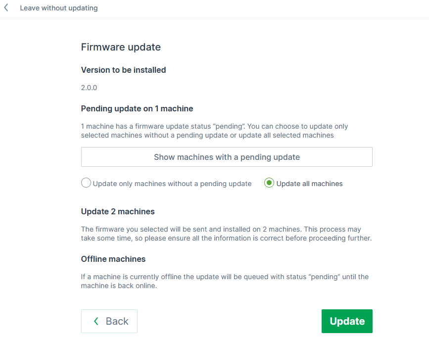 Figure 4: Firmware update information page You can then proceed with the firmware update for all machines or only those without a pending update.