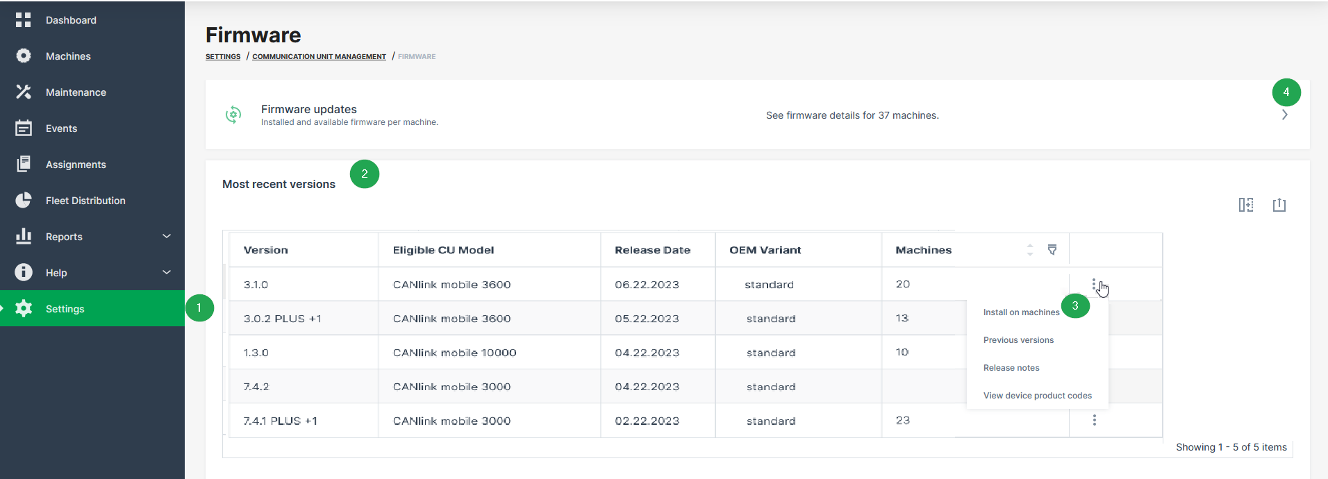 | 1 | Firmware menu in the sidebar to be opened via Settings > Communication Units Management. To activate the menu, see Requirements. |