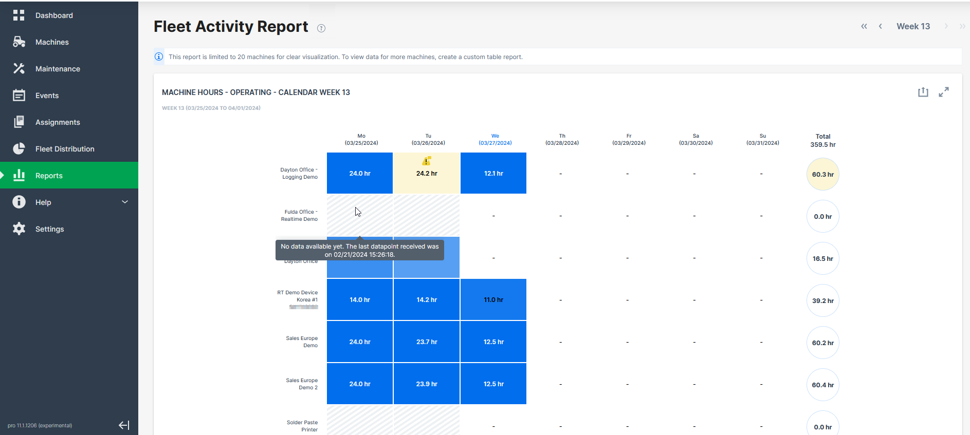 The Fleet Activity Report offers a report on the machine activity, specifically the machine's operating hours. The report shows a "heat map" per week for a maximum of 20 machines. The machine activity of the past 10 weeks can be checked.