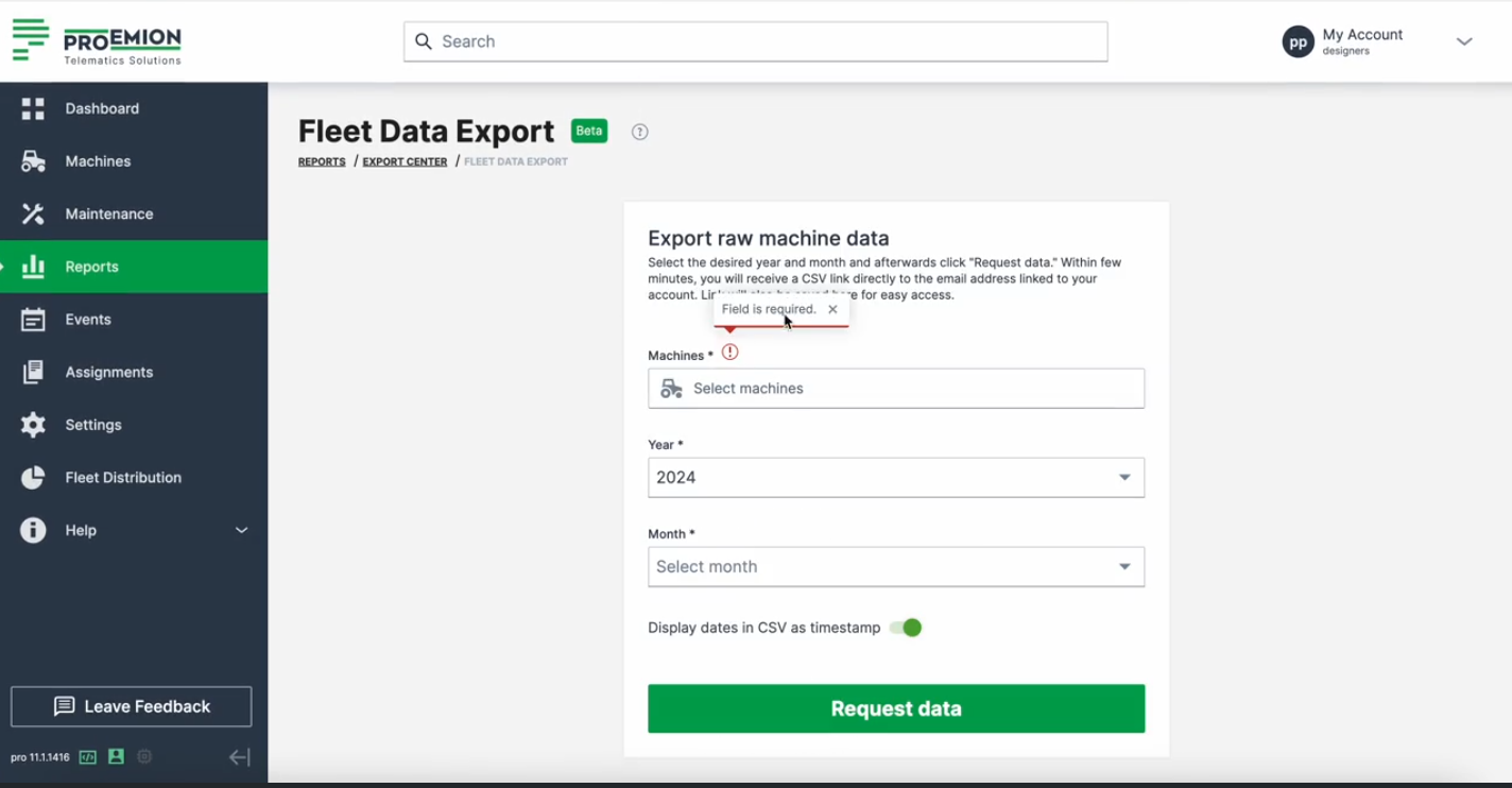 The Fleet Data Export provides a raw export of machine data as a ZIP file for a maximum of 20 machines for a selected time range.