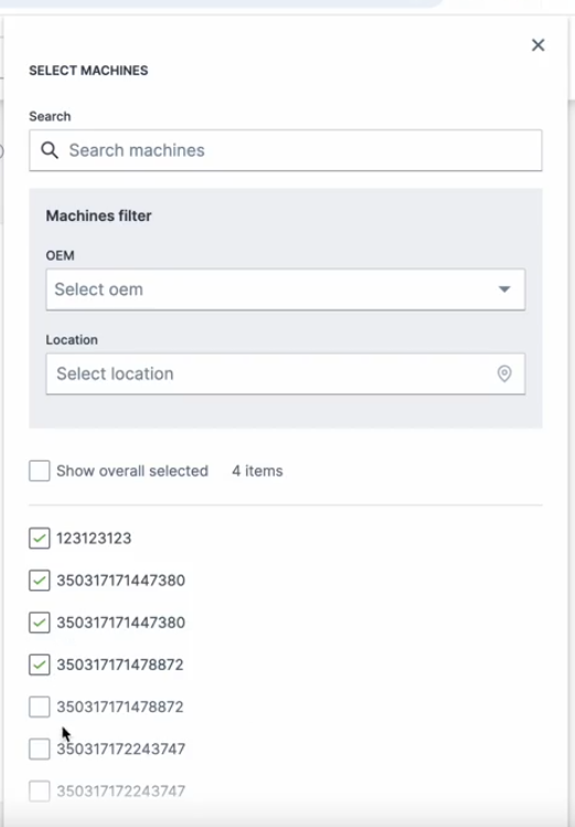You can filter the machines' list by OEM and/or location first, or search specific machines. Select them via the checkboxes: