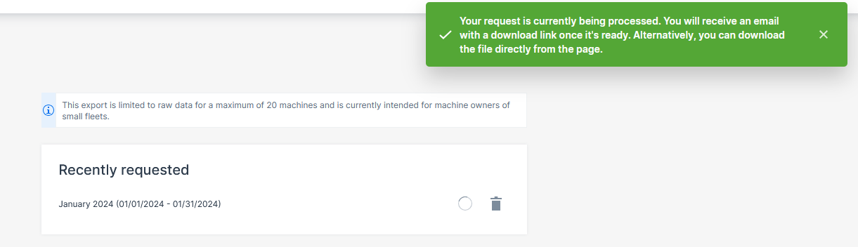 To request the export(s), select the desired year and month and select Request data. The start of the export will be indicated in a pop-up: