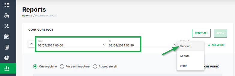 The bucket defines the time resolution of the output. All data points for the signal are combined using the defined aggregation type. When configuring Reports, the bucket Second can be selected, if the time range is below 3 hours, i.e. 2h 59 minutes or less, when combined with time range Absolute: