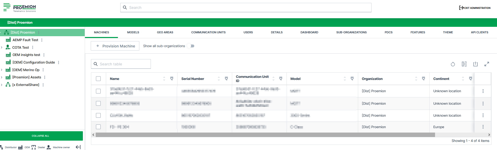 The tenant is typically the machine manufacturer and thus also the higher-level administrative organizational unit containing most of the organizational assets and configurations. Assets managed at the tenant are Models, PDCs, Dashboards, Legal Documents, OEM Name, Efficiency Definitions, Machine Share Definitions, Asset Types and Configuration Bundles.