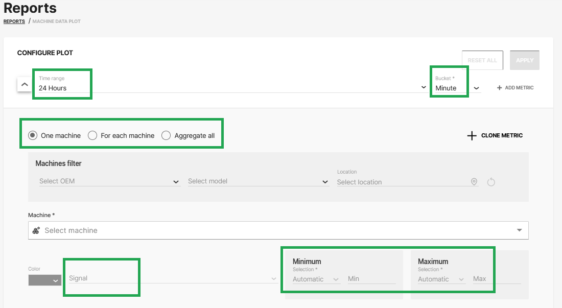 This plotting option aggregates the selected signals of all applicable machines into a single signal. Usually used in combination with a machine Model selection. If a machine Model is selected the operation includes date from all machines of that Model. The selected signal is then aggregated into one single signal covering all machines.