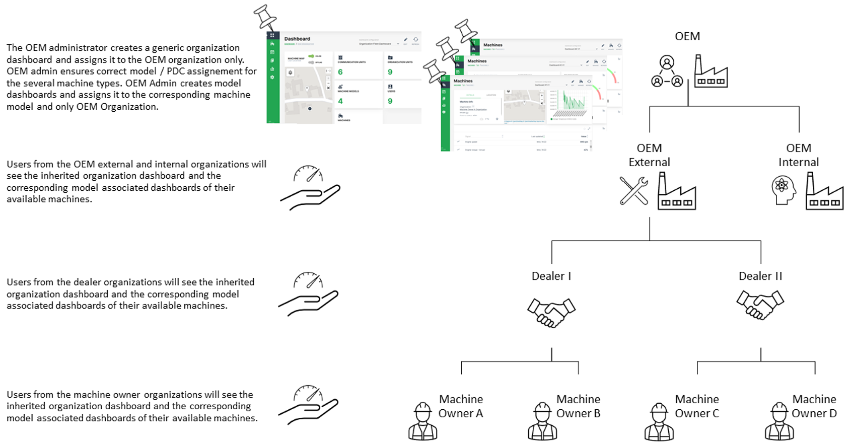 Especially when having a rather complex organization tree and a fleet with different machine types and models, the assignment of a dashboard to the organization and model has an important role for the visibility down to the machine owner organization through the entire organization tree.
