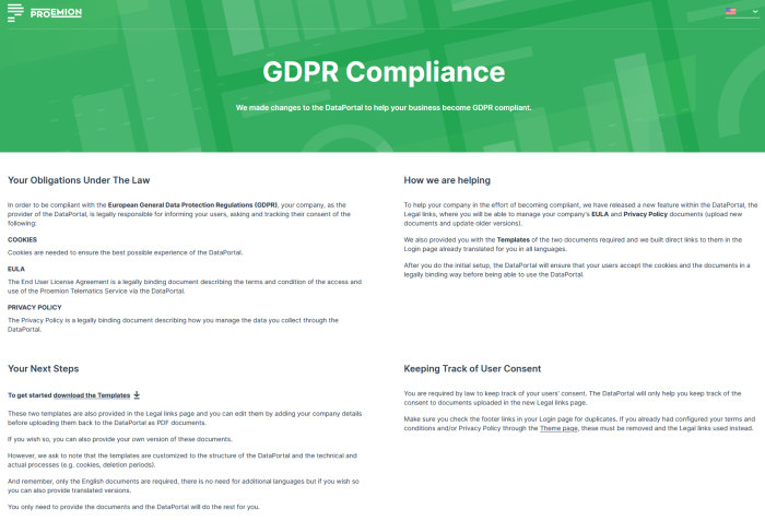 Select Read the Documentation and you are taken to the GDPR Compliance page (https://dataportal.proemion.com/legal-documentation) where you can read about your obligations and compliance instructions.