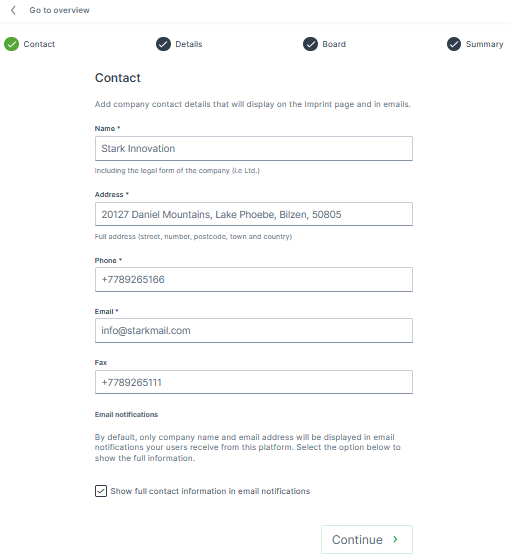 Complete the imprint details at the pages Contact,Details and Board.