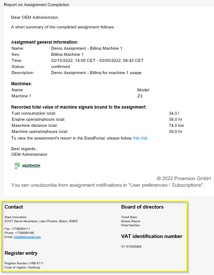 The customer imprint will be used in the footer of the following email notifications: