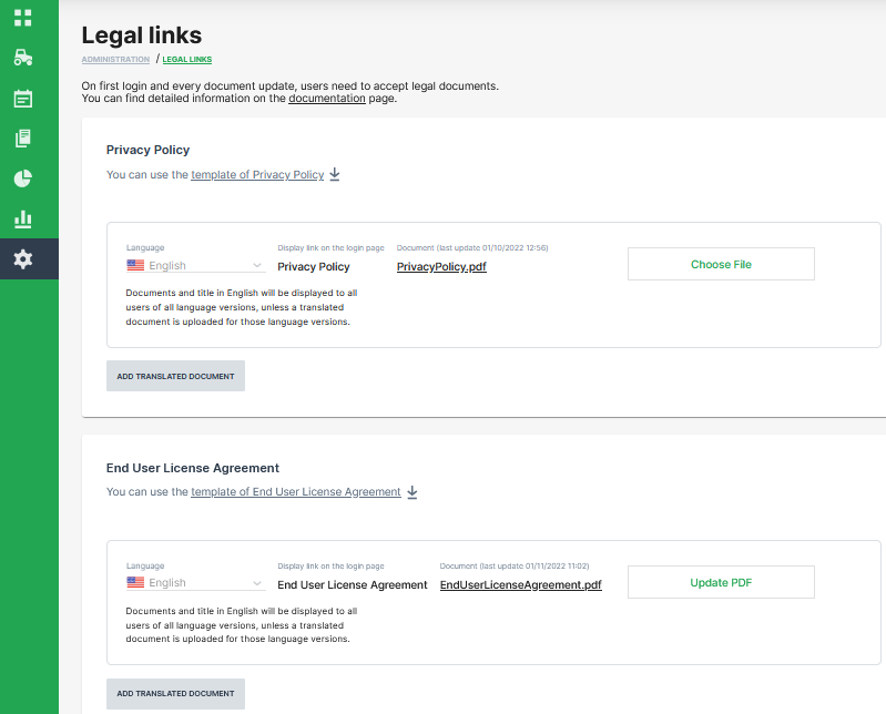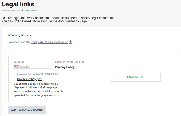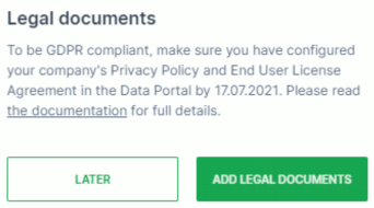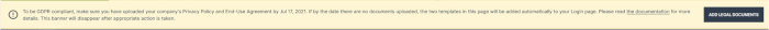 TEXT: To be GDPR-compliant make sure you have uploaded your company's Privacy Policy and End-User License Agreement by [date]. If by the date there are no documents uploaded, the two templates in this page will be added automatically to your Login page. Please read the documentation for more details. This banner will disappear after appropriate action is taken.